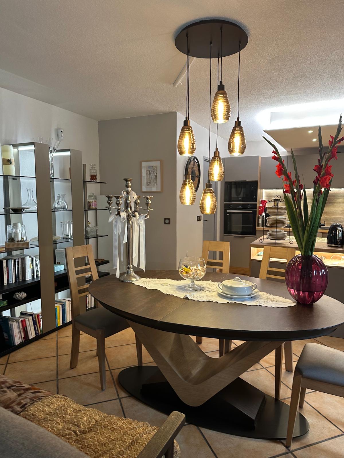La cuisine aux couleurs modernes , toute équipée, s'ouvre sur un confortable salon.